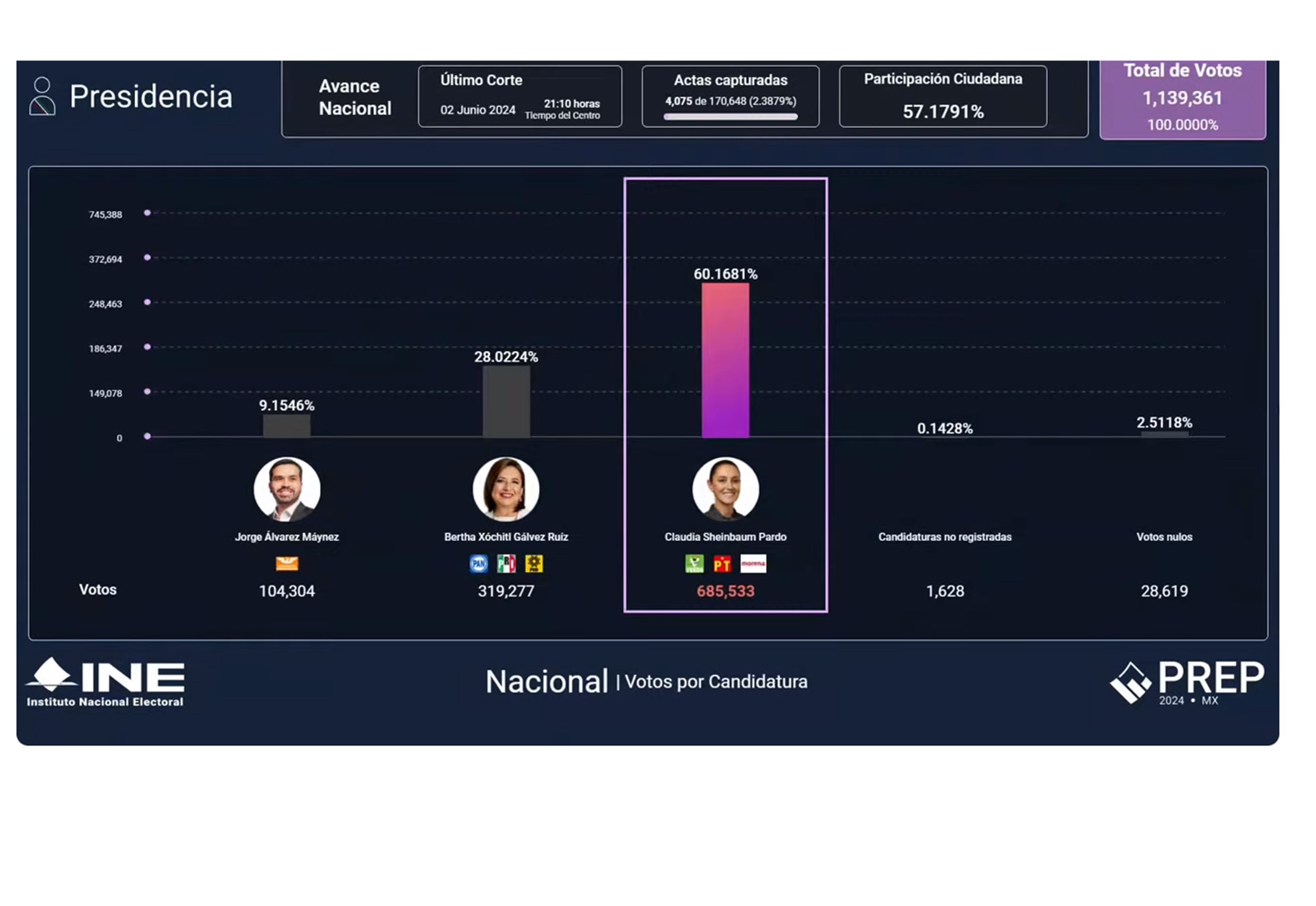 Siendo las 21:10 horas de la noche, los resultados del PREP dan hasta el momento como ganadora a la candidata Claudia Sheinbaum Pardo con el 60 por ciento de la votación.
