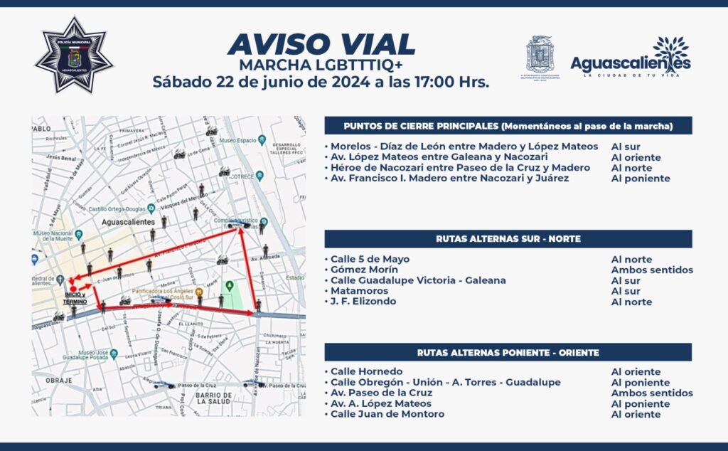 La Secretaría de Seguridad Pública Municipal de Aguascalientes a través de la Dirección de Movilidad informa sobre el cierre de calles por la tarde de este sábado 22 de junio con motivo de la Marcha del Orgullo LGBTTTIQ+ en Aguascalientes.