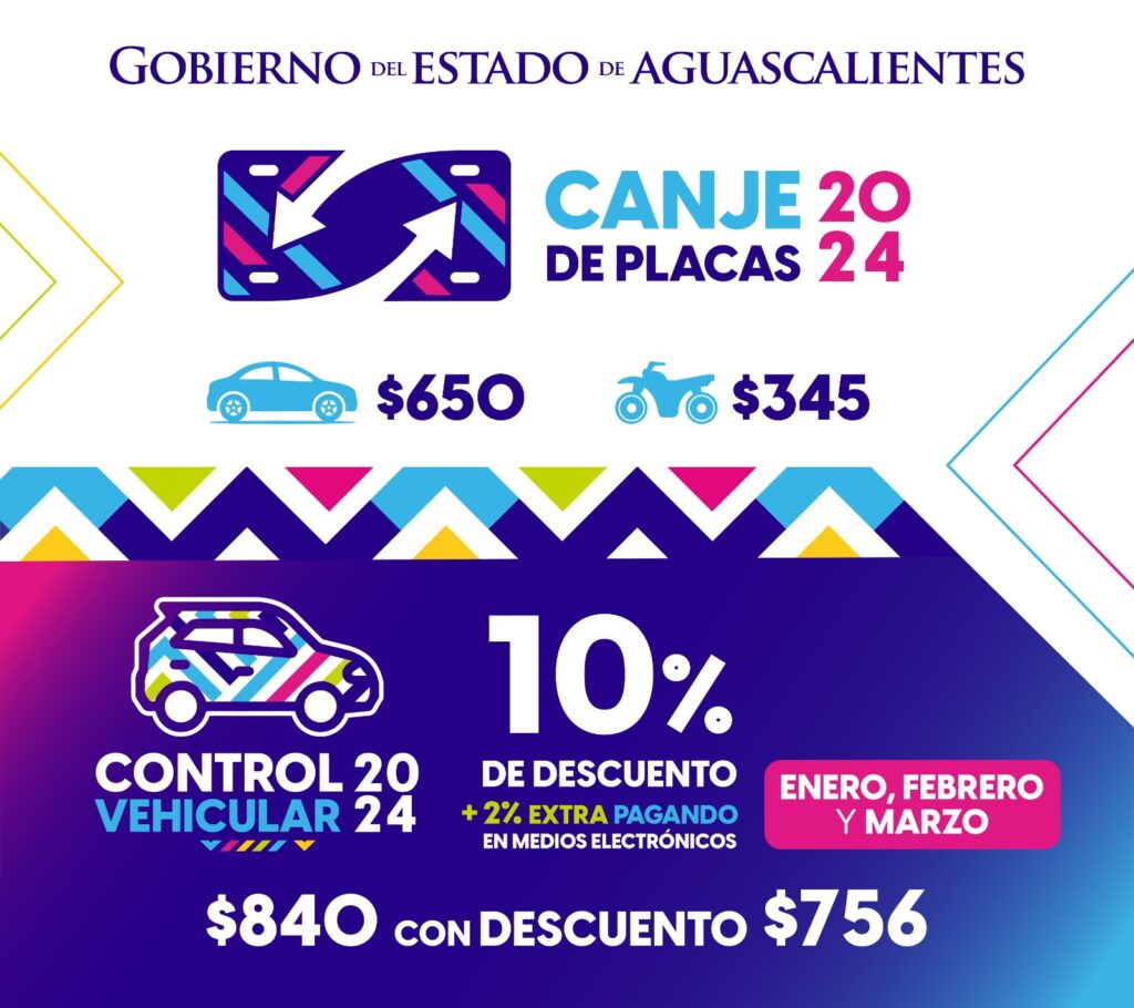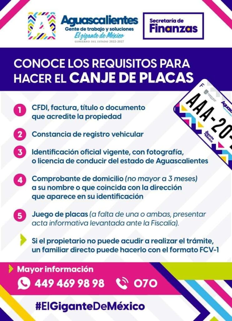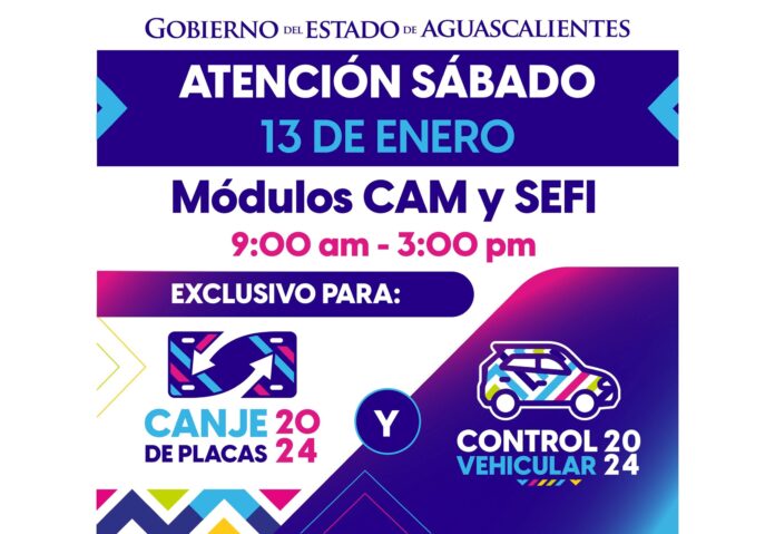 La Secretaría de Finanzas de Gobierno del Estado de Aguascalientes dio a conocer que este sábado 13 de enero estarán abiertas las ventanillas para realizar canje de placas y/o pago de control vehicular.