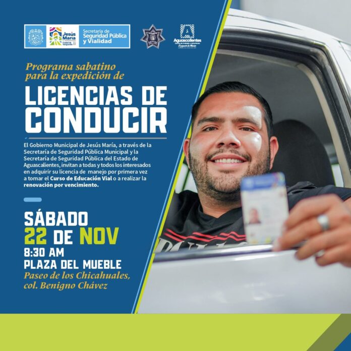 Este sábado 22 de noviembre, la Plaza del Mueble ubicada sobre Paseo de los Chicahuales, en la colonia Benigno Chávez, será sede de la jornada especial para la gestión de licencias de conducir, organizada por el Gobierno Municipal de Jesús María en colaboración con la Secretaría de Seguridad Pública y Vialidad Municipal y la Secretaría de Seguridad Pública del Estado.