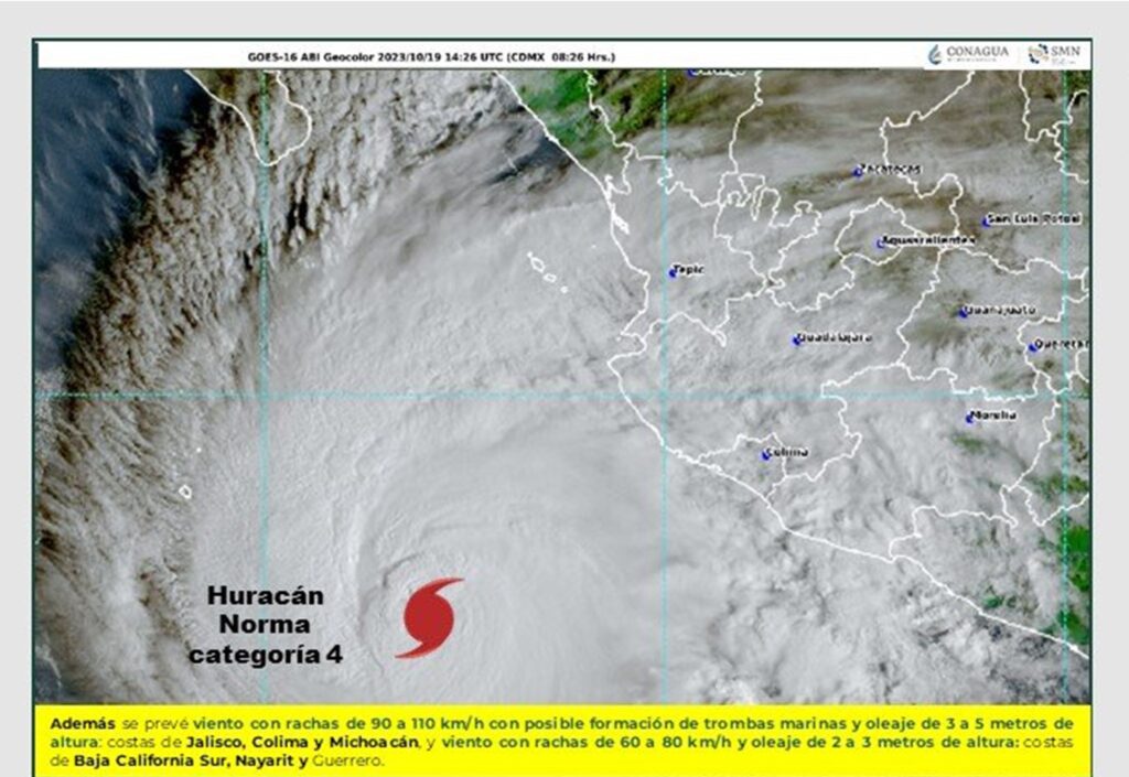 Huracán Norma se intensificó a categoría 4 en la escala Saffir Simpson, presenta Vientos máximos sostenidos de 215km/h y se esperan Lluvias intensas en Jalisco y Colima.