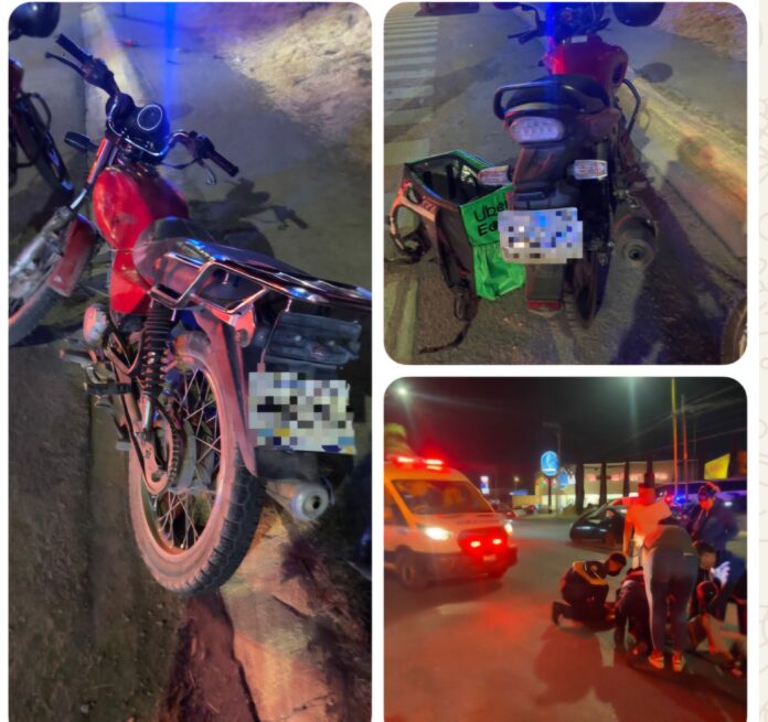 Un choque en ángulo entre dos motocicletas se registró la noche del domingo, alrededor de las 22:00 horas, en el cruce de Avenida San Gabriel y Avenida Vistas de Oriente.