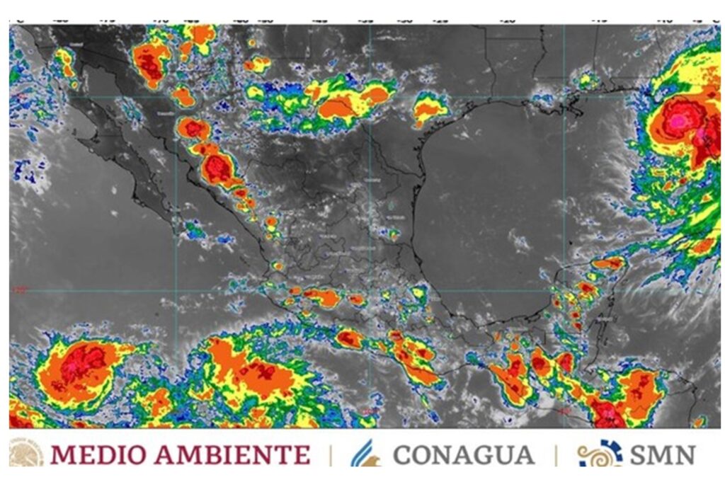 Para la noche de hoy y la madrugada de mañana lunes, se prevén lluvias muy fuertes (de 50 a 75 milímetros [mm]) en Nayarit, Jalisco, Colima, Michoacán y Guerrero Chiapas y Oaxaca; fuertes (de 25 a 50 mm) en Campeche, Coahuila, Durango, Estado de México, Morelos, Puebla, Quintana Roo, Sinaloa, Sonora, Tabasco y Veracruz; chubascos (de 5 a 25 mm) en Baja California, Baja California Sur, Chihuahua, Ciudad de México e Hidalgo, así como lluvias aisladas (de 0.1 a 5 mm) en Guanajuato, Nuevo León, Querétaro, San Luis Potosí, Tamaulipas y Zacatecas. Las lluvias mencionadas estarán acompañadas de descargas eléctricas y posible caída de granizo.