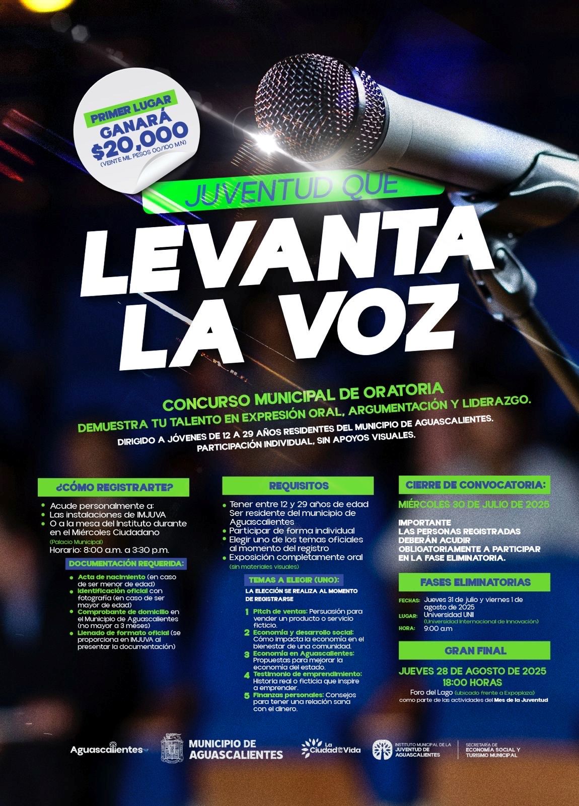 El Municipio de Aguascalientes, a través del Instituto Municipal de la Juventud, convoca a las y los jóvenes a participar en el concurso municipal de oratoria “Levanta la Voz”, una iniciativa que busca fomentar la expresión oral, el liderazgo y el pensamiento crítico entre las juventudes.