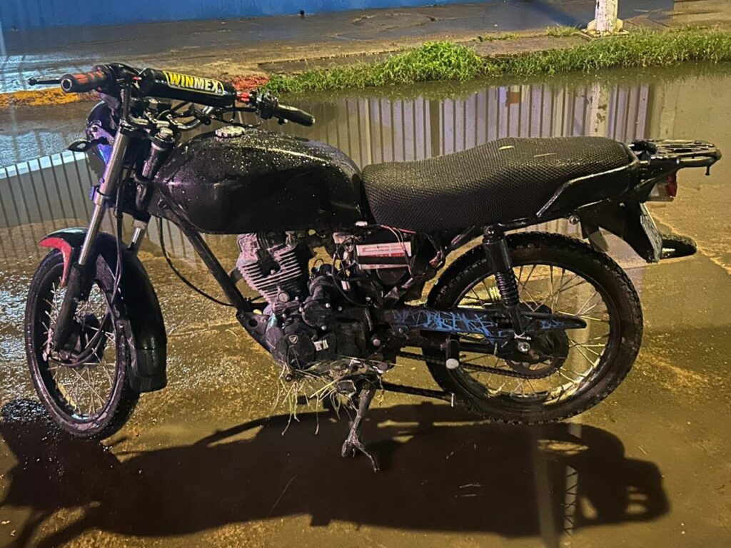 En una cuarta acción oficiales de la Policía Estatal que se encontraban realizando su recorrido de vigilancia sobre la Avenida Revolución y calle Nogal en la comunidad de San Antonio de Peñuelas al sur de la ciudad, detectaron una motocicleta de la marca Italika, en color verde, que transitaba sin placas de circulación, por lo que le indicaron a su conductor que detuviera la marcha de la unidad, al momento de realizarle una inspección tanto al vehículo como a la persona no presentó documentación oficial de la motocicleta y al momento de verificar el número de serie detectaron los oficiales de la Policía Estatal que se encontraba alterado e ilegible, motivo por el que fue detenida la motocicleta.
