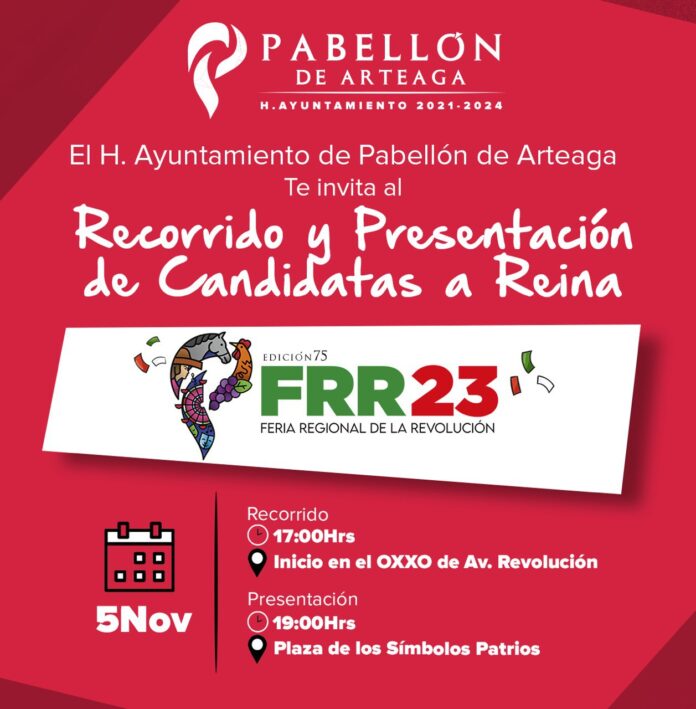 Para promover turísticamente las festividades, el Ayuntamiento de Pabellón de Arteaga llevará a cabo, el domingo 5 de noviembre, el recorrido y presentación de las candidatas a reina de la 75 Feria Regional de la Revolución.