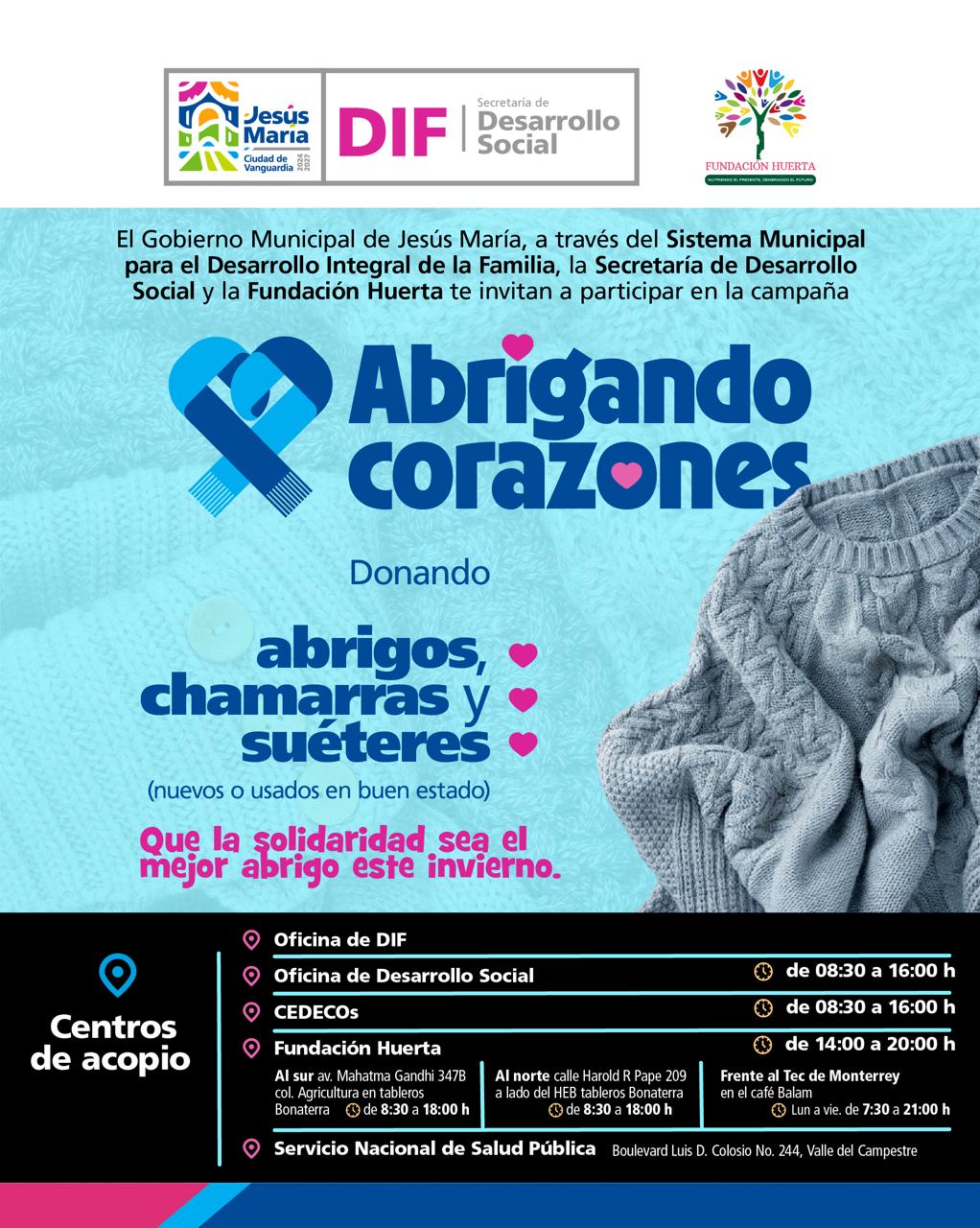 InicioMUNICIPIOSEste invierno, abriguemos corazones en Jesús María Este invierno, abriguemos corazones en Jesús María Published on noviembre 19, 2025 By Metropolitano Aguascalientes FacebookTwitterPinterestWhatsApp Súmate donando abrigos, chamarras o suéteres en buen estado. Tu solidaridad puede cambiar días fríos por días llenos de esperanza. TagsJesús María Latest articles ESTADO UAA, referente en Medicina; recibe triple acreditación de calidad El Departamento de Medicina de la Universidad Autónoma de Aguascalientes celebró la develación de... abril 17, 2026 CAPITAL Visita Leo Montañez colonias y comunidades para escuchar a la ciudadanía En un ambiente de diálogo el presidente municipal Leo Montañez realizó un recorrido por... abril 17, 2026 DEPORTES «Los Cuates» Prieto llevan a Rincón de Romos al escenario mundial Desde Rincón de Romos, Aguascalientes, dos hermanos ponen el nombre de México en lo... abril 17, 2026 ESTADO Taxi gratis para adultos mayores, personas con discapacidad y grupos vulnerables en Aguascalientes Para facilitar el acceso al transporte a quienes más lo necesitan, se puso en... abril 17, 2026 More like this ESTADO UAA, referente en Medicina; recibe triple acreditación de calidad El Departamento de Medicina de la Universidad Autónoma de Aguascalientes celebró la develación de... abril 17, 2026 CAPITAL Visita Leo Montañez colonias y comunidades para escuchar a la ciudadanía En un ambiente de diálogo el presidente municipal Leo Montañez realizó un recorrido por... abril 17, 2026 DEPORTES «Los Cuates» Prieto llevan a Rincón de Romos al escenario mundial Desde Rincón de Romos, Aguascalientes, dos hermanos ponen el nombre de México en lo... abril 17, 2026