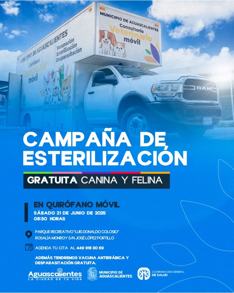 La Coordinación General de Salud del Municipio de Aguascalientes informa que el sábado 21 de junio del 2025 llevará los servicios del Quirófano Veterinario Móvil al parque “Luis Donaldo Colosio”, ubicado en la calle Rosalía Monroy s/n en el fraccionamiento José López Portillo (La Barranca).