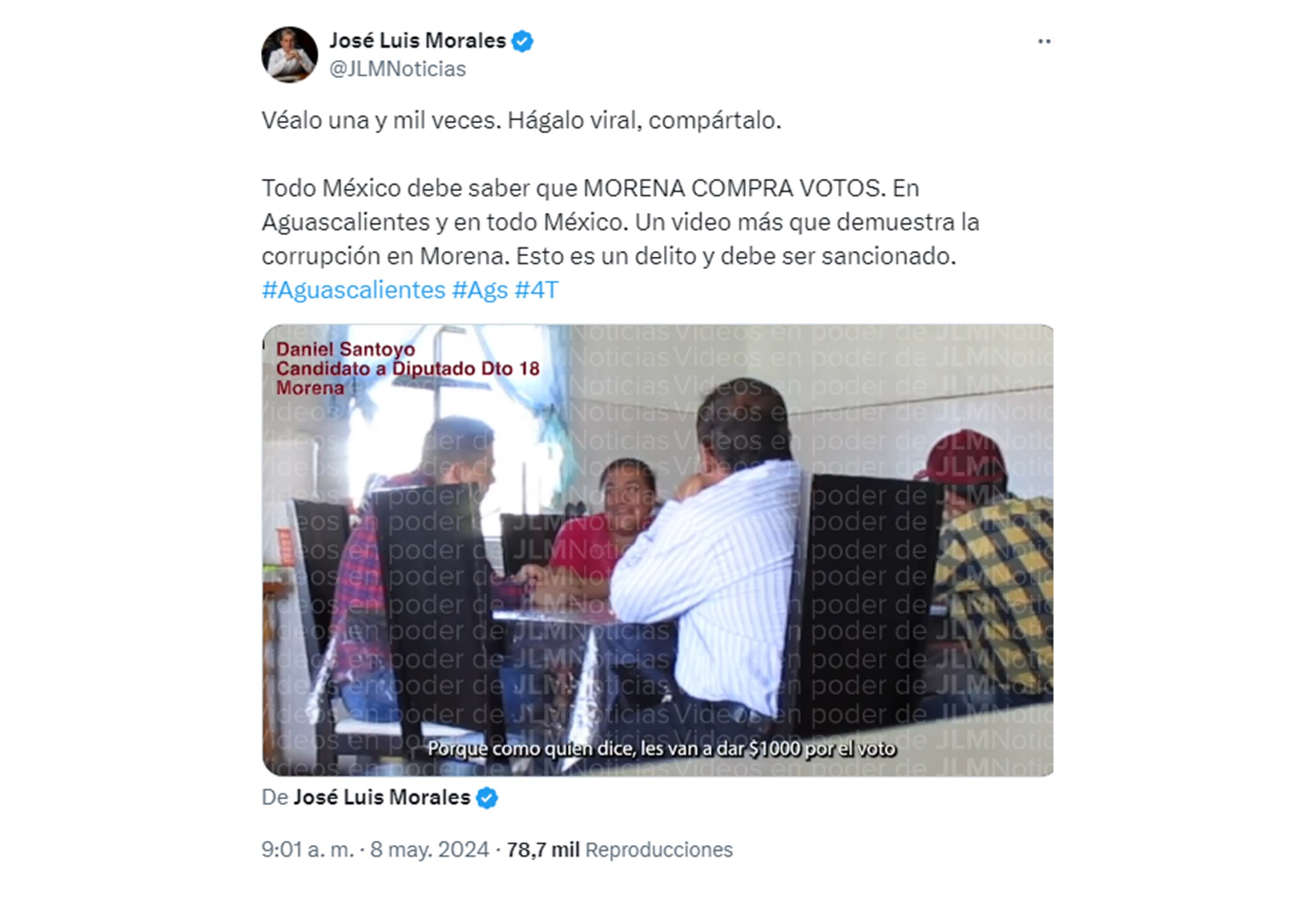 El titular de Infolínea, José Luis Morales, publicó la mañana de este miércoles un video en el que se exhibe a Daniel Santoyo, candidato a diputado local por el distrito 18 de Aguascalientes, en una reunión con una líder de colonia acordando la compra de votos.