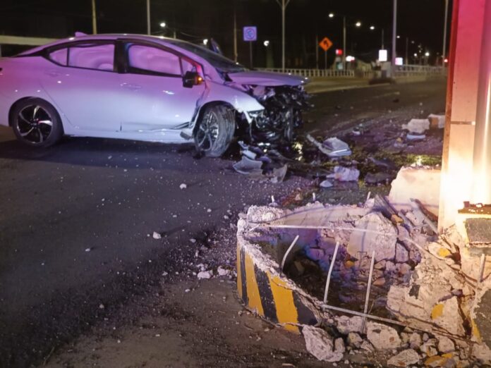 Al llegar a la altura del fraccionamiento Los Sauces, perdió el control del automóvil hacia la derecha, impactándose contra una base de concreto de un señalamiento vial.