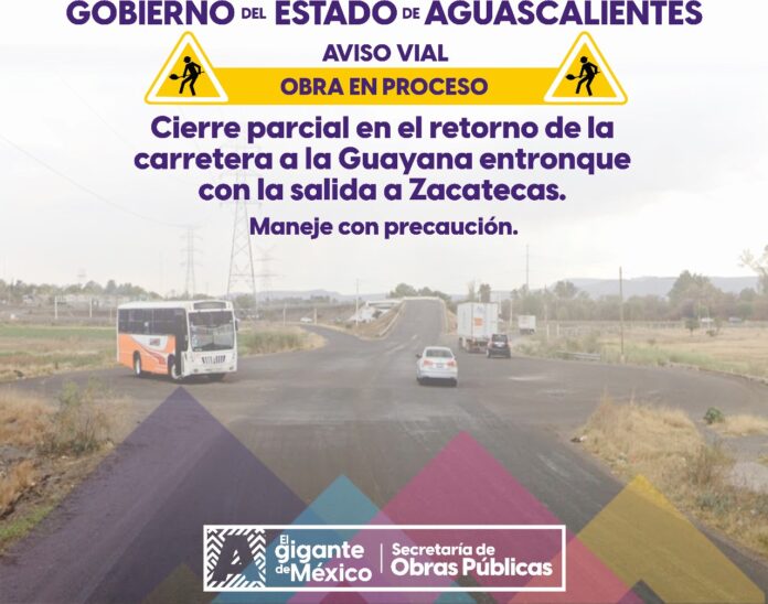 Debido a trabajos de reencarpetamiento, se realizará un cierre parcial en el retorno de la carretera a La Guayana, entronque con la salida a Zacatecas; además, se le dará mantenimiento a la gaza de incorporación en ambos sentidos. Los trabajos serán por la mañana y tarde a partir de este miércoles 16 de octubre.