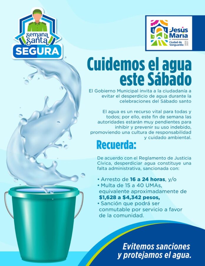 El Gobierno Municipal de Jesús María hace un llamado a la ciudadanía a evitar el desperdicio de agua durante la celebración del Sábado de Gloria y a utilizar de manera responsable este recurso vital.
