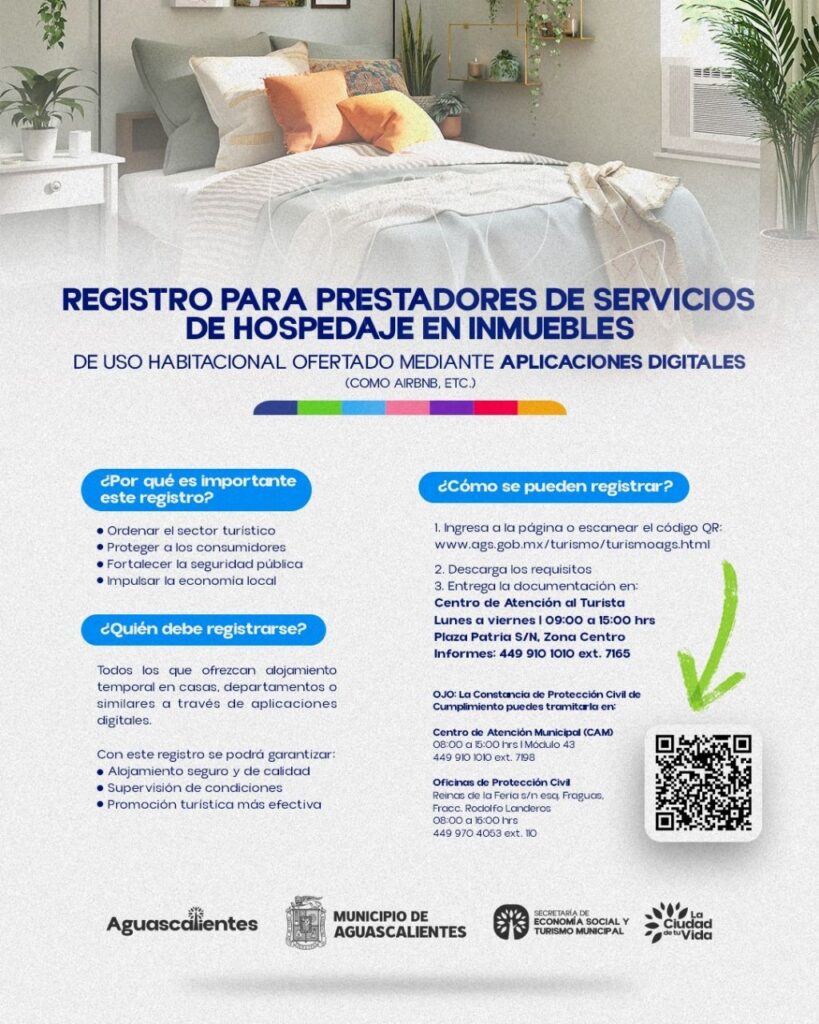 El registro, que será administrado por la SETUM, busca también asegurar que los espacios ofertados cumplan con estándares mínimos de calidad y seguridad, con el fin de brindar a los visitantes una mejor experiencia y posicionar a Aguascalientes como un destino turístico confiable, moderno y competitivo. Asimismo, la medida reforzará la seguridad tanto de turistas como de residentes, y permitirá prevenir posibles actividades ilícitas relacionadas con el hospedaje informal.