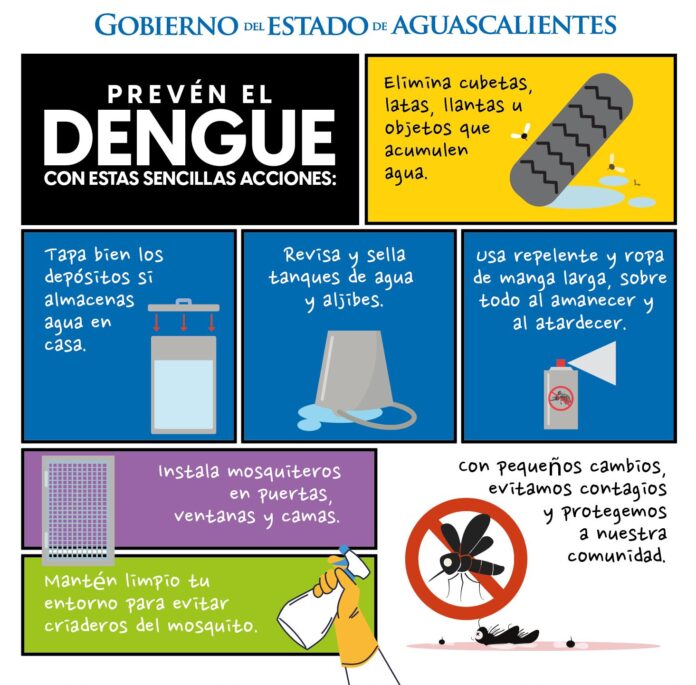 Ante la llegada de las lluvias, la Secretaría de Salud del Estado de Aguascalientes te invita a poner en práctica algunas medidas preventivas para evitar contagios de dengue, una enfermedad transmitida por el mosquito Aedes aegypti.