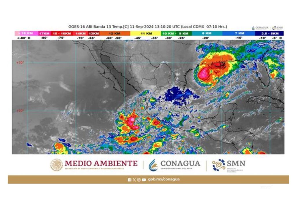 Para este día se pronostican lluvias puntuales intensas (de 75 a 150 milímetros [mm]) en regiones de Colima, Guerrero, Jalisco y Michoacán; muy fuertes (50 a 75 mm) en zonas de Aguascalientes, Chiapas, Guanajuato, Hidalgo, Nayarit, Oaxaca, Puebla, Querétaro, San Luis Potosí, Veracruz y Zacatecas; fuertes (de 25 a 50 mm) en áreas de la Ciudad de México, Estado de México y Tabasco; intervalos de chubascos (de 5 a 25 mm) en Campeche, Morelos, Nuevo León, Quintana Roo, Sinaloa, Tamaulipas, Tlaxcala y Yucatán, así como lluvias aisladas (de 0.1 a 5 mm) en Durango. Las lluvias podrán estar acompañadas de descargas eléctricas, rachas fuertes de viento y caída de granizo.