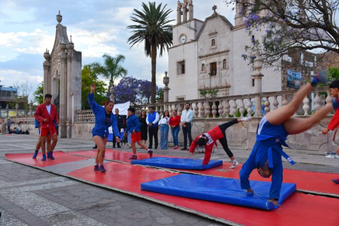 Como parte de las actividades del Día del Deporte, se llevaron a cabo exhibiciones de gimnasia, sambo y voleibol en la explanada de la plaza principal, donde familias y asistentes disfrutaron del talento local.