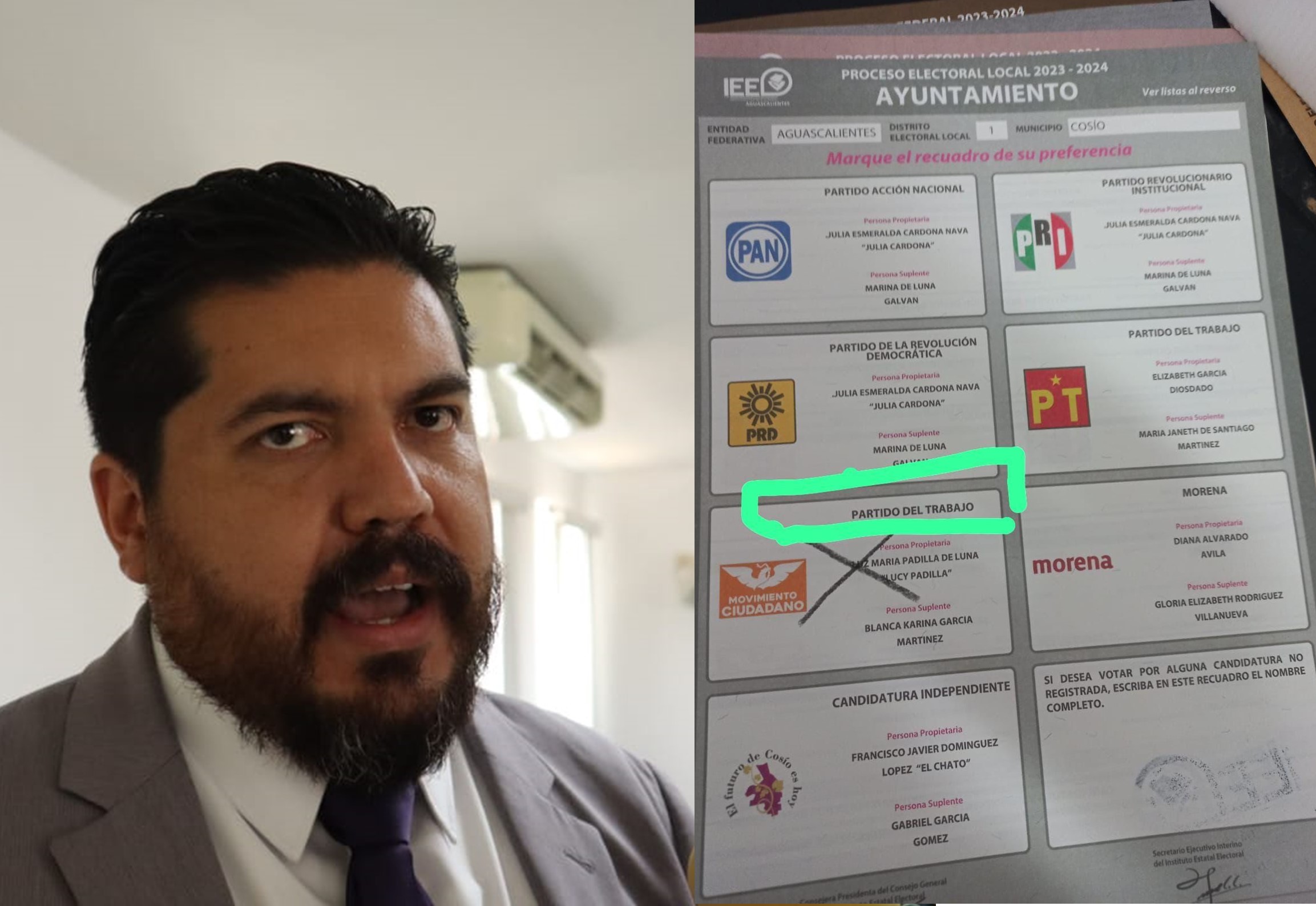 El representante de Movimiento Ciudadano ante el Instituto Estatal Electoral (IEE), Gabriel Sánchez, denunció que las boletas para la presidencia municipal de Cosío están mal impresas, pues aparece el nombre de la candidata, Lucy Padilla, logotipo del partido naranja, que es al que pertenece, pero el nombre del Partido del Trabajo.
