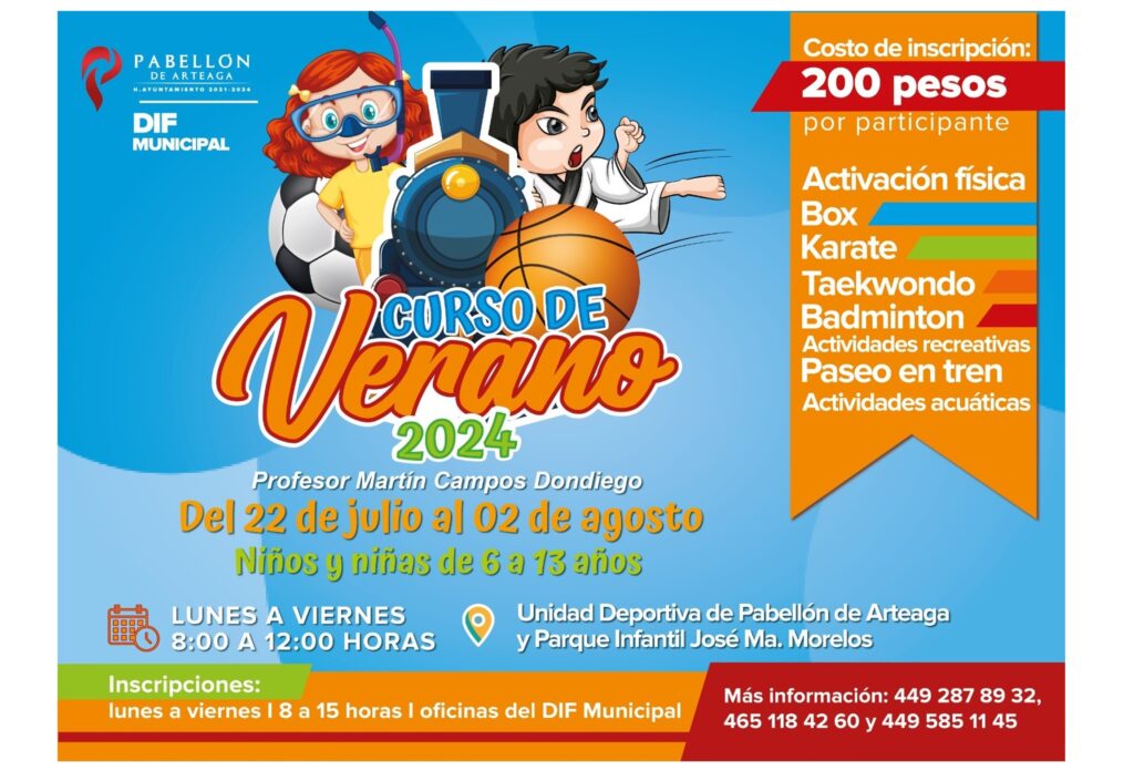 La Presidencia Municipal de Pabellón de Arteaga, que encabeza Bernardino Flores Valles, a través del Sistema DIF Municipal, invita a niñas y niños de 6 a 13 años a participar en los cursos de verano “Vacaciones Culturales” y “Profesor Martín Campos Dondiego”, los cuales se llevarán a cabo del lunes 22 de julio al viernes 2 de agosto.