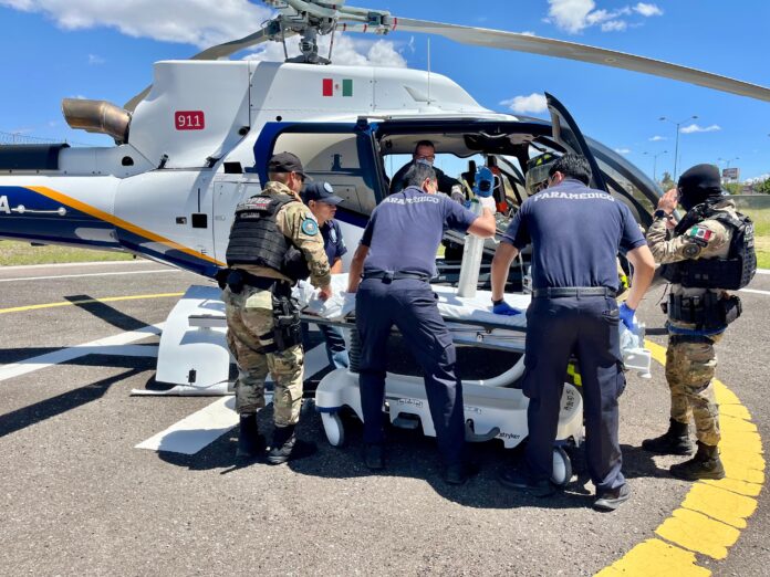 Paramédicos del Grupo Aeromédico Táctico GAMET del helicóptero “Fuerza Uno” de la Secretaría de Seguridad Pública del Estado de Aguascalientes (SSPE) realizaron un traslado aeromédico de una paciente en estado grave, desde el municipio de Calvillo al municipio capital, para ser ingresada en el área de urgencias del Hospital Hidalgo al presentar fractura craneoencefálica y facial, además de muñecas, tórax y cadera.