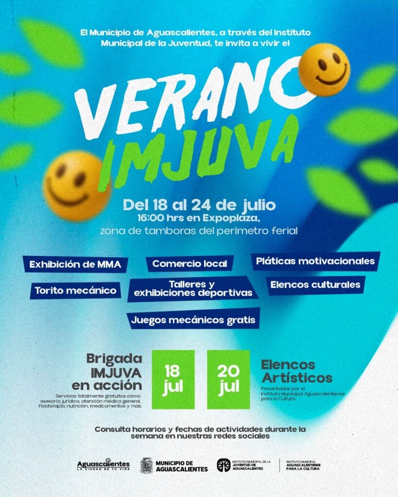 El Municipio de Aguascalientes, a través del Instituto Municipal de la Juventud (Imjuva), invita a todas y todos a vivir una semana llena de energía, diversión y actividades para toda la familia en el evento “Verano Imjuva”, que se llevará a cabo del 18 al 24 de julio, a partir de las 16:00 horas, en el andador Expoplaza.