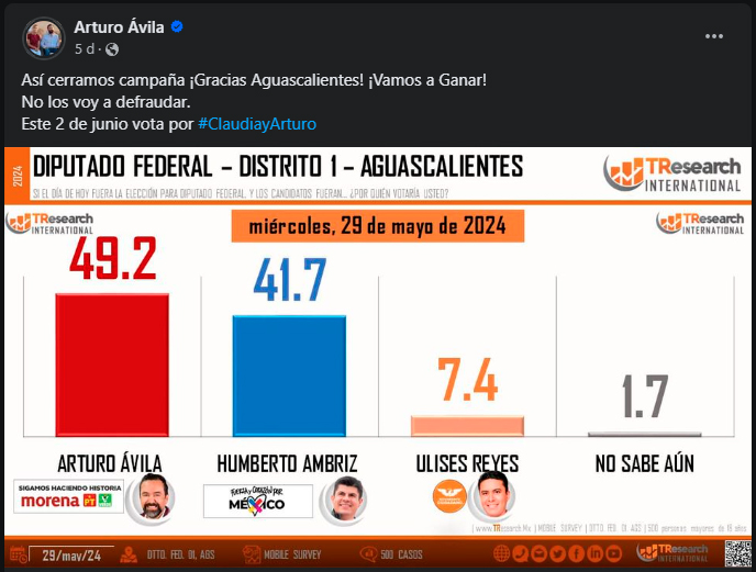 Y fiel a su costumbre, no le llegó la derrota sin antes haber presumido en sus redes sociales encuestas en las que iba ganando. La última de ellas, la presumió justo el último día de campaña, afirmando que se encontraba al menos 8 puntos por encima de su más cercano competidor.