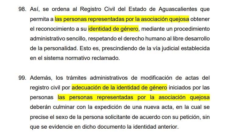 Ante esto, y con el voto de 7 integrantes de la Corte, se determinó ordenar al Registro Civil del Estado de Aguascalientes que permita obtener el reconocimiento de identidad de género, mediante un procedimiento administrativo sencillo, sin necesidad de acreditar algún requisito adicional a la manifestación de su interés en ese sentido, al considerar que estos beneficios de momento, solamente aplicarán a las personas representadas por el organismo civil promovente a la fecha de la determinación.