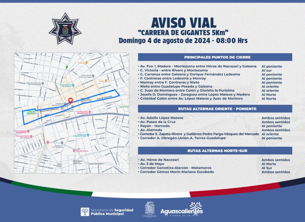 La Policía Vial de Aguascalientes de la Secretaría de Seguridad Pública Municipal de Aguascalientes (SSPM), tiene listo el operativo para la «Carrera de Gigantes 5KM», que se llevará a cabo el próximo domingo 4 de agosto en punto de las 08:00 horas.