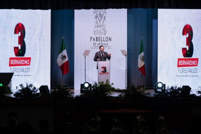 Bernardino Flores Valles presentó a la ciudadanía logros y resultados contundentes de la administración municipal 2021-2024 de Pabellón de Arteaga, que fueron obtenidos con trabajo y compromiso en los temas que más preocupaban a las y los pabellonenses: seguridad, infraestructura y atención a las familias.