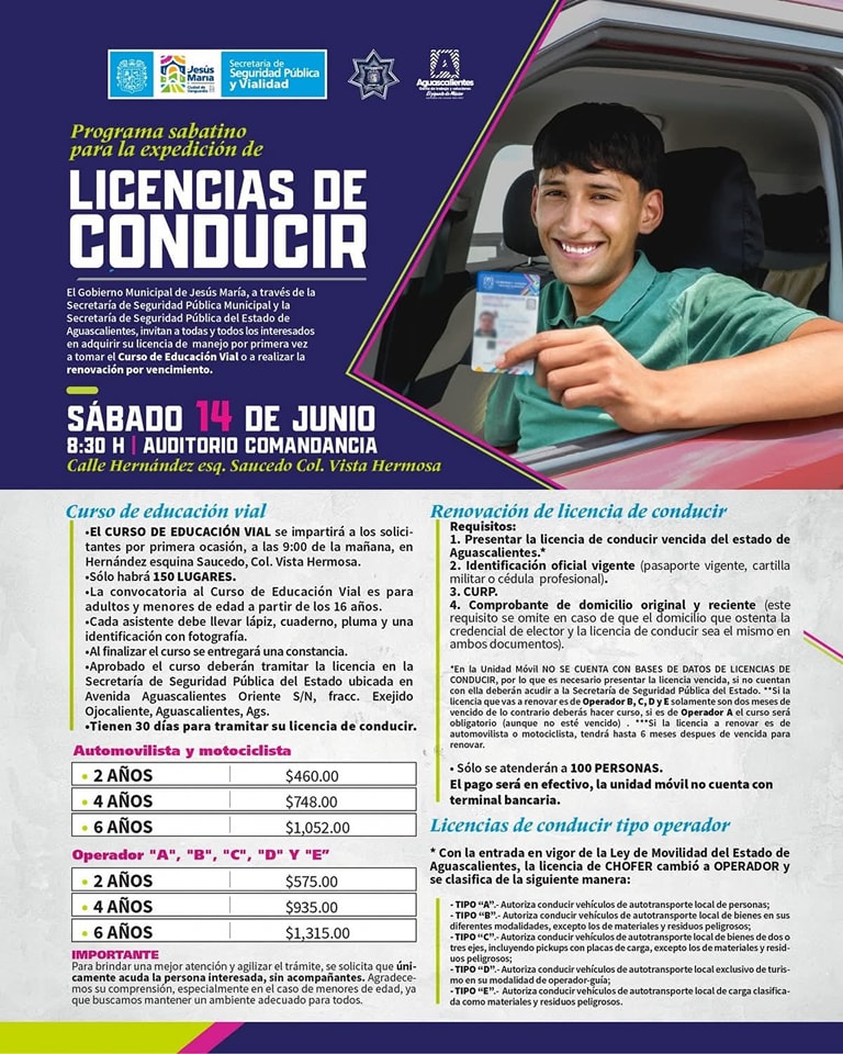 El próximo 14 de junio, el programa sabatino para la expedición de licencias de conducir llegará al municipio de Jesús María, por ello, el Gobierno Municipal, a través de la Secretaría de Seguridad Pública Municipal y en coordinación con la Secretaría de Seguridad Pública del Estado, invita a todas y todos los interesados en obtener su licencia de conducir por primera vez o renovarla por vencimiento a aprovechar esta oportunidad.