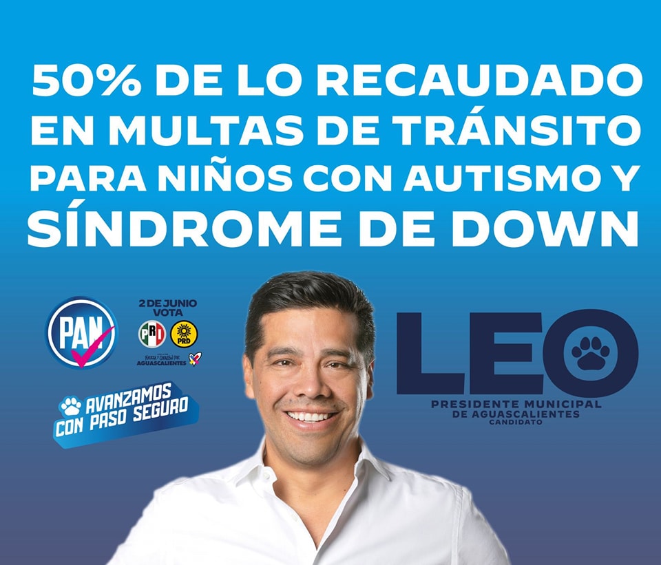 Leo Montañez, abanderado de la coalición Fuerza y Corazón por Aguascalientes a la presidencia municipal de la capital, dio a conocer que uno de sus compromisos para la siguiente administración municipal, será destinar al menos 20 millones de pesos, que son el 50% de lo que el Municipio recaude en multas de tránsito, para apoyar a personas en situación vulnerable, que tengan alguna discapacidad, síndrome de down o espectro autista, con el fin de que puedan solventar gastos de transporte, terapias, medicamentos o lo que ellos requieran.