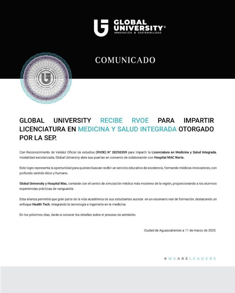 Con Reconocimiento de Validez Oficial de estudios (RVOE) N° 20250359 para impartir la Licenciatura en Medicina y Salud Integrada, modalidad escolarizada, Global University abre sus puertas en convenio de colaboración con Hospital MAC Norte.