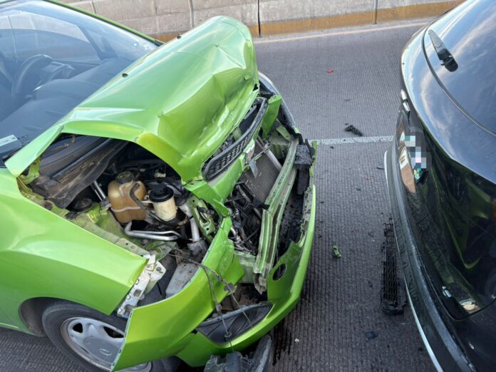 Al llegar a la altura de la Avenida Ignacio Zaragoza, el conductor no mantuvo una distancia prudente de seguridad, lo que provocó que impactara su parte frontal contra la parte posterior de una camioneta Chevrolet Trax.