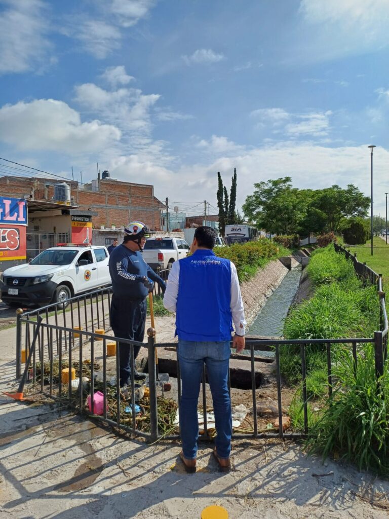 En el canal de la Colonia Estrella ubicado sobre la avenida Gabriela Mistral, personal de la Coordinación Municipal de Protección Civil refuerzan las labores de limpieza y retiro de desechos como ramas, hojas y bolsas de plástico, entre otros, para liberar la boca de tormenta ubicada en la intersección con la calle Tauro, en donde baja la corriente de agua proveniente de la presa de Los Gringos.