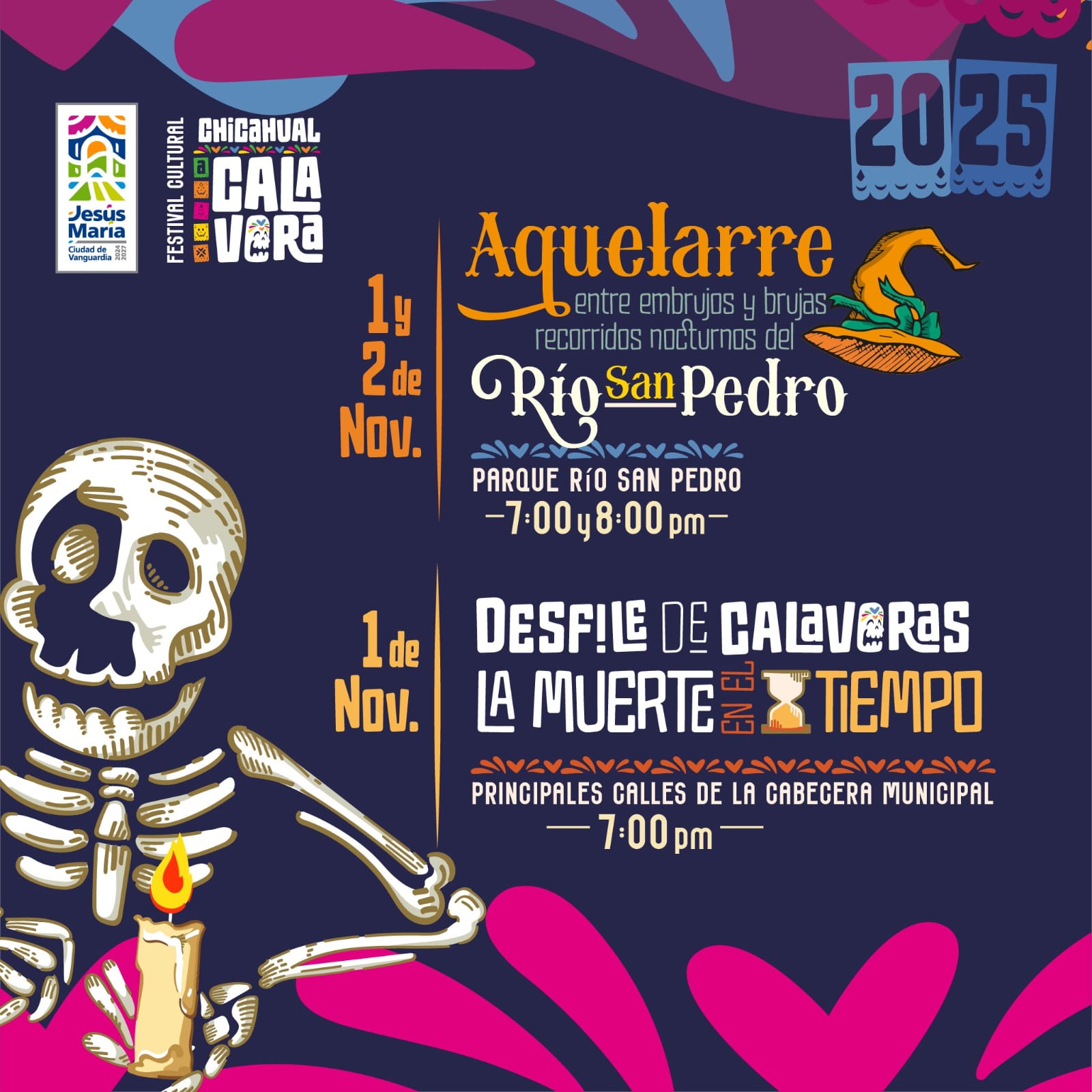 El Gobierno Municipal de Jesús María invita a la población a disfrutar del recorrido nocturno “Aquelarre: entre embrujos y brujas”, que se llevará a cabo los próximos 1 y 2 de noviembre en el Parque Río San Pedro, como parte del Festival Cultural de Chicahual a Calavera 2025.