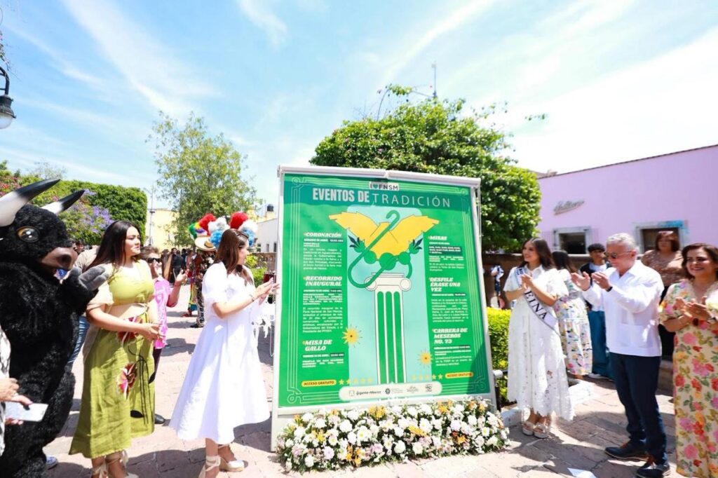 Durante el acto protocolario, las autoridades presentes, junto con la reina de la edición 2025, Daniela Martínez, la reina electa de la FNSM 2026, Alexa González, y sus princesas Andy Díaz y Mina J. Sevilla, fueron las encargadas de develar los bandos solemnes colocados en cada una de las cuatro puertas del Jardín de San Marcos.