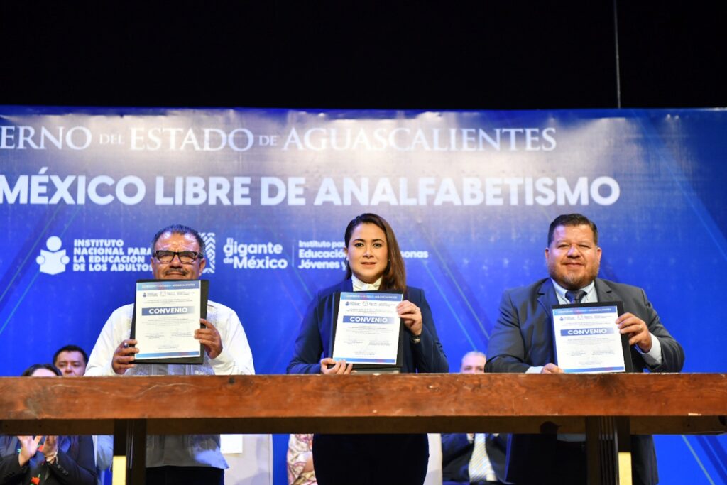 Con el objetivo de sumar esfuerzos para combatir el analfabetismo y reducir el rezago educativo, la gobernadora de Aguascalientes, Tere Jiménez, firmó el convenio de colaboración “Por un México Libre de Analfabetismo” con Armando Contreras, titular del Instituto Nacional para la Educación de los Adultos (INEA) del Gobierno de México.