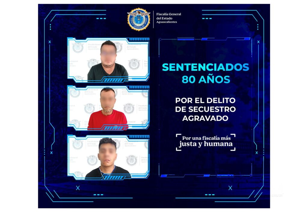 La Fiscalía General del Estado de Aguascalientes, logró que un Juez emitiera sentencia condenatoria en contra de Edgar Enrique, alias “El Uber”, Heladio Alejandro, apodado “El Gallo” y César Alejandro, conocido como “El Esquizo” y/o “El Chorizo”, tres sujetos generadores de violencia en la entidad, e integrantes de un grupo delictivo, quienes deberán pasar 80 años en prisión, tras ser acusados por el delito de secuestro agravado, hechos registrados el pasado 31 de marzo del 2024.