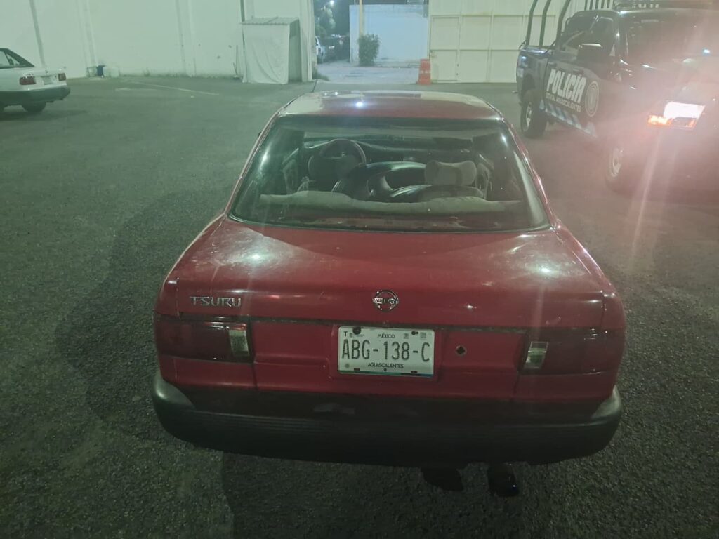 Oficiales del Grupo Motorizado Dragones que se encontraban realizando en su recorrido de vigilancia sobre Bulevard José María Chávez atendieron el reporte que se recibió de los monitoristas del C5i, quienes indicaron que habían detectado un vehículo en circulación de la marca Nissan, Tsuru, en color rojo, con placas de circulación del Estado de Aguascalientes y que había arrojado alerta de reporte de robo en las cámaras, motivo por el que de inmediato los policías fueron hacia el sitio donde indicaban los operadores del C5i.