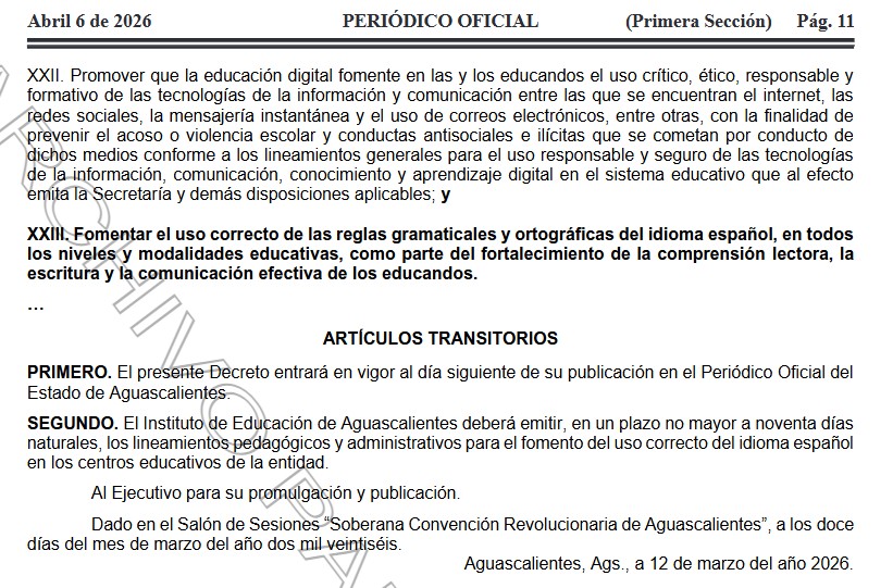 Este martes 7 de abril entró en vigor la reforma a la Ley de Educación del Estado para garantizar el “uso correcto del lenguaje” en las escuelas de Aguascalientes, cambio legal que fue aprobado por el Congreso del Estado el pasado 12 de marzo, con 16 votos a favor, del Partido Acción Nacional (PAN) y Movimiento Ciudadano.